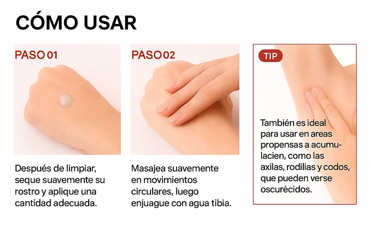 Su acción exfoliante suave elimina las células muertas sin agredir, revelando una piel más luminosa, uniforme y con un brillo saludable.